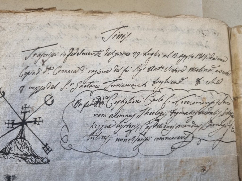 Per oggi ho scelto un’immagine che mi è cara e che ho ritrovato recentemente in archivio storico comunale, dove mi reco settimanalmente a studiare (colgo l’occasione per salutare gli amici archivisti, Antonella, Maurizio e Andrea, che mi assistono sempre con una gentilezza e una perizia unici): si tratta dell’Uomo del Golgota disegnato dal canonico Carlo Castiglioni nell’ultima pagina della copia da lui fatta della Cronaca dell’Adamollo nel 1819 (Arch. St. Com. Va., Cat I cartella 14). Credo non sia necessario ricordarvi che l’Adamollo è stato uno dei massimi cronisti varesini, nato nel 1687: recuperando la cronaca del Giulio Tatto e passando poi a scrivere da testimone oculare, riportò la storia di Varese dagli anni compresi fra il 1575 e il 1745: a proseguire il suo lavoro fu un medico, il dott. Luigi Grossi, che la compilò sino al 1846. Ma dei cronisti varesini di epoche diverse dalla nostra, e ciononostante che tutti noi cronisti dovremmo conoscere e tesaurizzare, riparleremo in seguito.