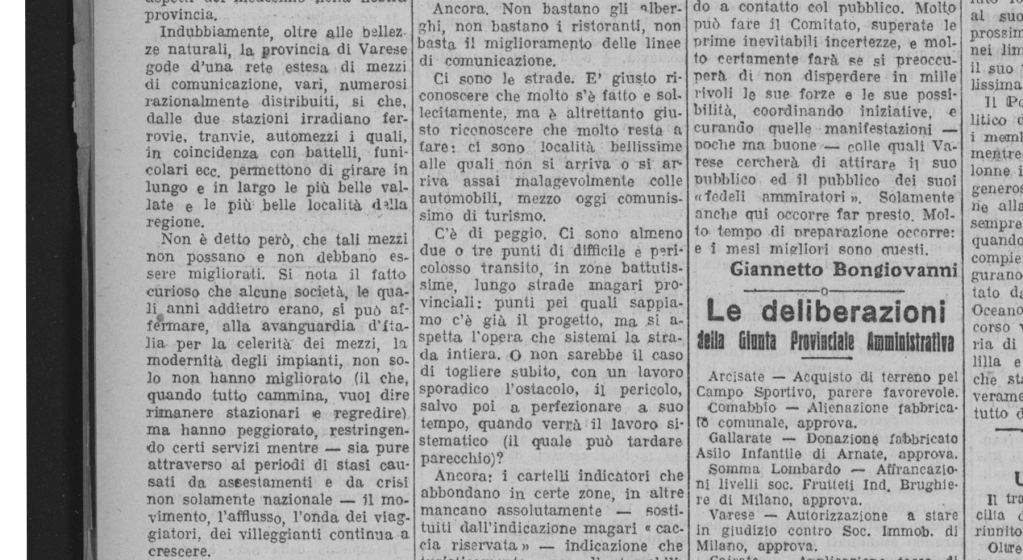 Proviamo ad immaginarci quell’ora (magari senza ritardi…) di percorso in un mattino di gelo dell’incipiente inverno. Flora, donna colta e curiosa, vuole arrivare nella città che la ospiterà fino alla fine dell’anno scolastico informata sui luoghi e sulle situazioni in cui si troverà ad operare: così, in stazione a Milano, acquista probabilmente la Cronaca Prealpina in edicola, nell’edizione domenicale che a quel tempo copre anche il lunedì. Subito le balza all’occhio un pezzo di Giannetto Bongiovanni – molto ben scritto, si sarà detta – che traccia un rapido sguardo sullo stato dell’arte del turismo a Varese e provincia: una vera e propria “questione turistica” dibattuta in quei giorni nella Provincia Giardino, “fra tutte le sue consorelle italiane una delle meglio dotate, una delle più felici, una delle più belle”, benché ci sia ancora molto da migliorare nella rete di comunicazioni: “dalle due stazioni – legge Flora – irradiano ferrovie, tranvie, automezzi i quali, in coincidenza con battelli, funicolari ecc, permettono di girare in lungo e in largo le più belle vallate e le più belle località della regione. Non è detto – osserva il cronista – che però non possano essere migliorati”.