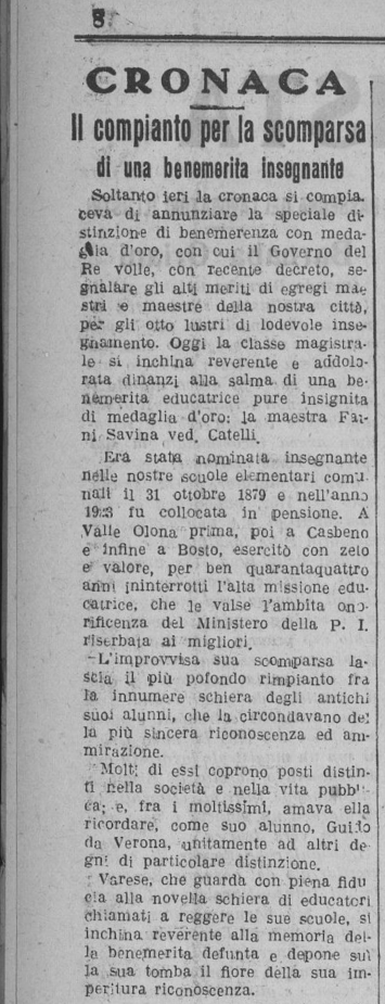 La nostra maestrina è felice: si sente chiamata in un ambiente che le sarà sicuramente amico. Già immagina di far lezione con la sua classe immersa in quegli scenari incantati: fiumi, laghi, monti, colline… Scorrendo le pagine, viene catturata dalla rubrica delle Notizie letterarie che riporta un’offerta di un milione di lire fatta da un editore americano ad “uno scrittore e poeta italiano, italianissimo, il più grande di tutti”, Gabriele D’Annunzio, “purché egli si impegni a scrivere un libro autobiografico”. E mentre ai suoi occhi, dal finestrino, gli scenari prealpini si fanno sempre più nitidi e si inseguono i monti e i campanili, inseguendosi con le notizie del giornale – al Sociale danno, in quei giorni, proprio per le scuole elementari, gli spettacoli delle marionette di Yamba – un trafiletto in chiusura la immalinconisce: Varese piange la sua maestra Savina, insignita della medaglia d’oro ai benemeriti, morta dopo breve malattia e quarant’anni di insegnamento iniziati proprio nella scuola dove Flora sta per prendere servizio: alla De Amicis di Valle Olona. Savina Faini, questo il nome della compianta, ha avuto l’onore di avere fra i suoi allievi anche lo scrittore di successo Guido Da Verona.
