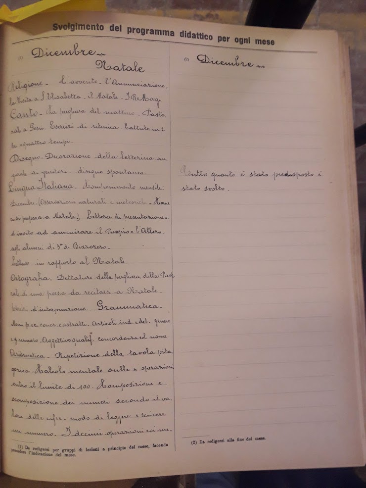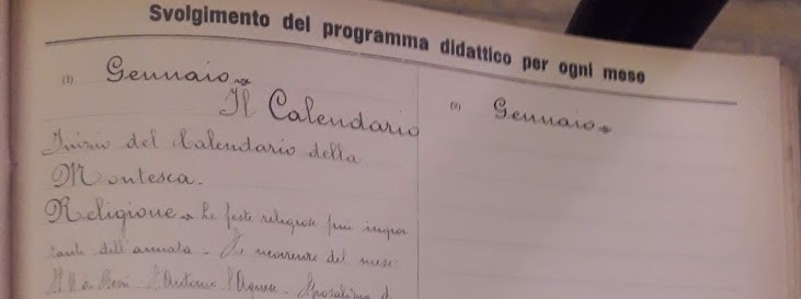 Il bel diario, puntuale nella sottile scrittura a pennino, si snoda in triplice forma: un rapido schema annuale, un programma mensile e un resoconto in cui la maestra annota di volta in volta le vicende più significative occorse in classe. Ma nel programma mensile balza all’occhio un dettaglio non secondario, e potete immaginare la mia emozione nell’apprenderlo: la giovane insegnante è di formazione montessoriana ed è probabilmente una delle prime maestre specializzate nel metodo che tanta fortuna avrà nei decenni successivi. Flora, infatti, ha cura di definire con cura il proprio “Calendario della Montesca” negli argomenti da trattare per ogni materia: per prima viene la religione, affrontata con le preghierine ma anche la spiegazione del culto popolare dei santi, dopodiché si passa al canto e al disegno dal vero, dove saper tratteggiare lo schizzo di una foglia degli alberi del giardino della scuola – che diverranno per lei e le sue allieve totemici amici e custodi – è altrettanto importante quanto l’ortografia e le regole dell’aritmetica.