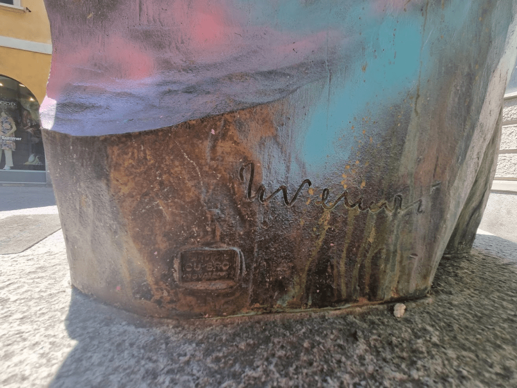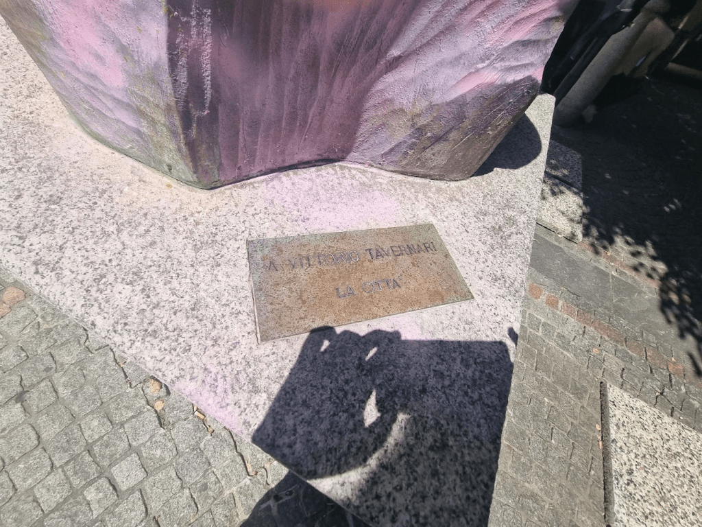Il secondo simbolo offeso è, dicevo, il totem dello scultore Tavernari, sfregiato da un atto vandalico più di una settimana fa. Domenica, ossia ieri, si presentava ancora imbrattato di vernice, nonostante l’indignazione generale e ipocritamente propositiva sorta all’indomani dei fatti, sotto gli occhi dei passanti noncuranti e dei clienti del ristorante vicino che pranzavano in sua muta compagnia.