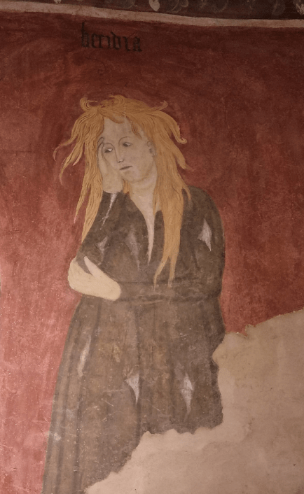 (Dedicato a mamma Claudia, il cui funerale è stato celebrato stamattina a Masnago. Claudia, con cui ci eravamo spesso reciprocamente confidate il peso delle nostre malattie – la sua fisica, la mia spirituale – aveva letto ed apprezzato il mio blog, era una donna colta, una letterata che amava l’arte. Dopo la funzione sono andata con mio figlio Agostino al Castello di Masnago e per una promessa che le avevo fatto mentalmente il giorno che è tornata al Cielo mi sono specchiata nella raffigurazione dell’Accidia nel meraviglioso Salone dei Vizi e delle Virtù: sono io, è vero. Sono rimasta folgorata e commossa. Ma di questa visita splendida alle sale del Castello mi riprometto di scrivere più diffusamente, perché meritano davvero, nei prossimi giorni).