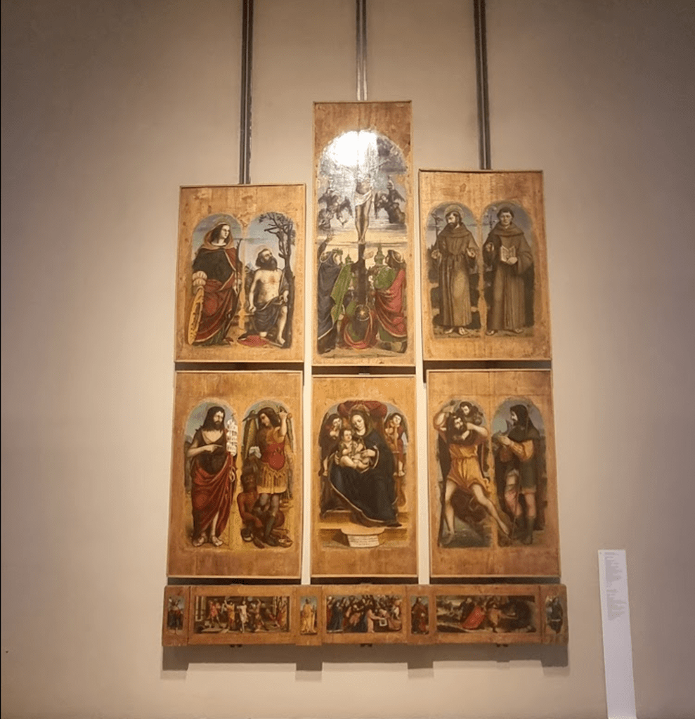 Terminato l’incontro mi ero spostata nelle varie sale della Pinacoteca per ammirarla, e mi ero prontamente imbattuta in un’opera nostrana, ceduta al Castello Sforzesco nel 1972: il celeberrimo Polittico di Francesco de’ Tatti, datato 1517 e proveniente dalla castellanza di Bosto (in sant’Imerio si può ammirarne tuttora una riproduzione).