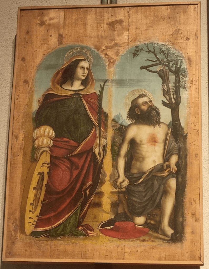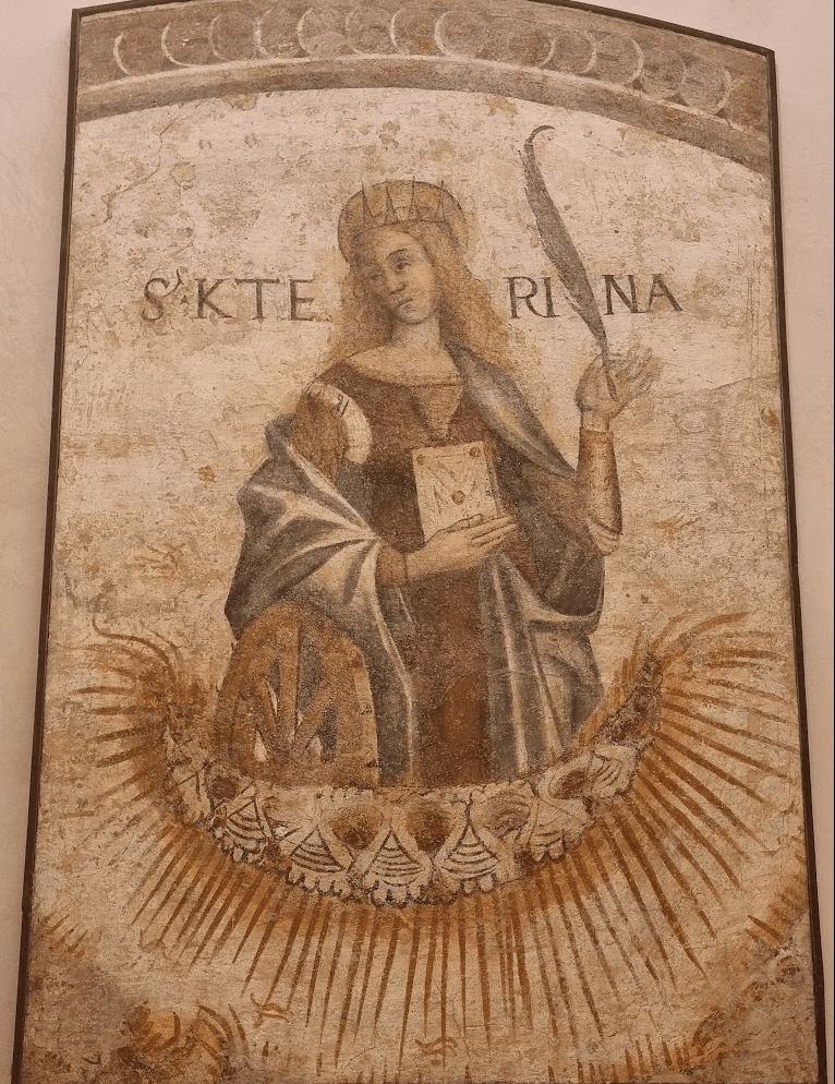 La santa Caterina conservata a Casa Romei, di ignoto artista ferrarese, tratta dalla soppressa chiesa di sant’Andrea in Ferrara. Gli attributi sono la palma e il libro, con a fianco la ruota dentata simbolo del martirio avvenuto ad Alessandria d’Egitto nel 304.