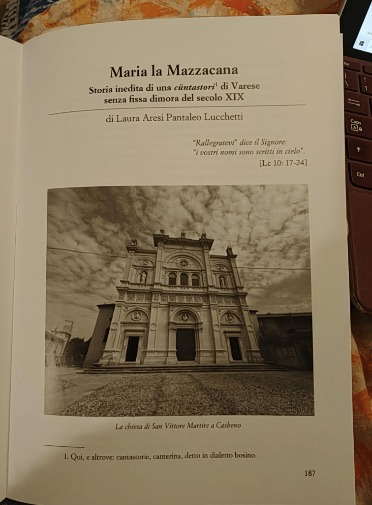 E’ così che, a cento e cinquant’anni di distanza dalla morte, anzi cinquantuno, ho voluto ridare voce alla povera, bella cantastorie che, per le strade di Varese e sul sagrato di sant’Antonio intonava canzonette giocose e irriverenti indirizzandole a personaggi locali, col volto dipinto dai carboncini per ricordare che era la Strega della Motta: lei che essendo donna, e senza un tetto sulla testa, fu inchiodata all’etichetta di matta, quando era al contrario una umile cantrice di piazza degli anni del Risorgimento, nata assieme alla città di Varese, e destinata a morire lontano, in incolpevole, silente esilio.