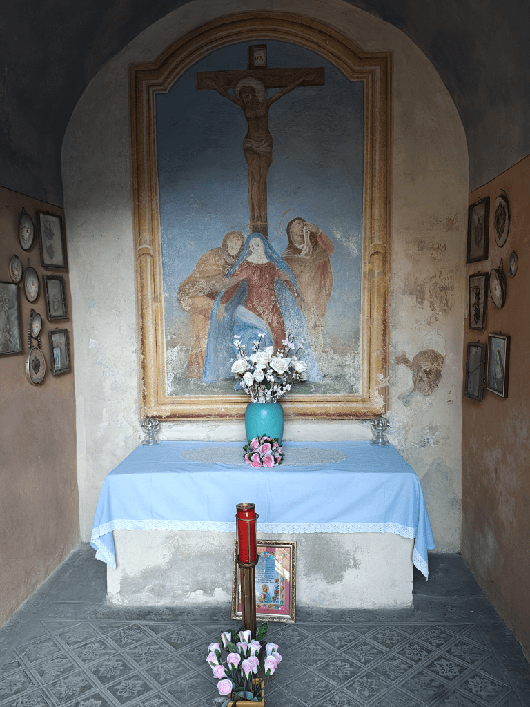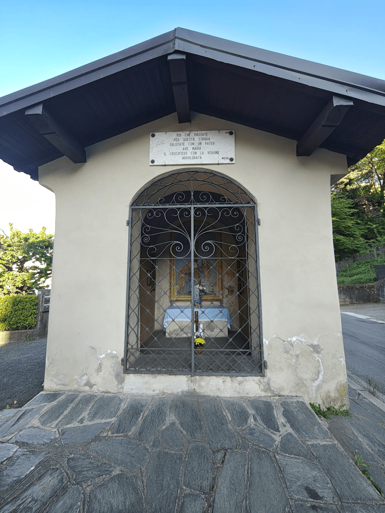 Sono scesa con il mio bambino, nel tardo pomeriggio, dopo una giornata domestica di serenità e di studio di poesia e di poeti, sino alla cappellina sotto casa. Mi è molto cara: con lei e solo con lei volevo inaugurare il mese mariano, particolarmente impegnativo anche per i miei figlioli che si approssimano alla conclusione del periodo scolastico, qualcuno agli esami. Questa cappellina, uno degli edifici più antichi di Varese, si trova all’incrocio di via Postumia con via Pola, e attraverso una breve scalinata conduce in Valle. Porta impressa nella lapide commemorativa la data del 1441: un anno forse di pestilenze, che meritava di essere immortalato con un piccolo edificio votivo a ricordo, uno dei tanti peraltro che si trovano lungo le vie di campagna, che oltre a serbare memoria di un qualche evento prodigioso o tragico offrivano riparo ai contadini quando all’improvviso scoppiava una tempesta, ed erano meta di preghiere individuali quanto di processioni (ancor oggi si ricorda la presenza di un antico monastero lungo la via, ristrutturato da tempo a casa privata).