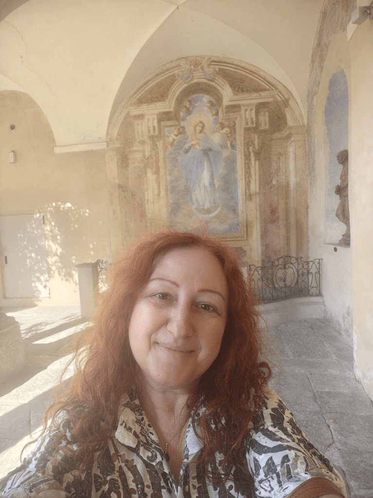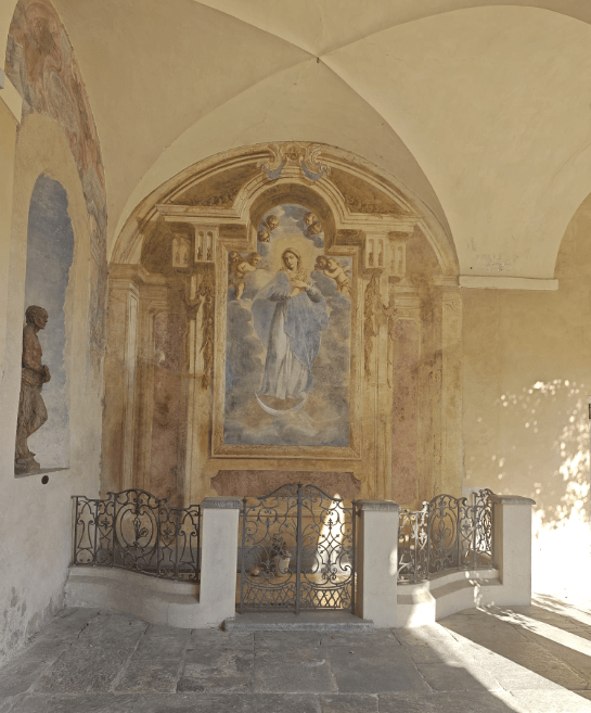Detto fra noi, tanto non ci legge nessuno (o quasi): ho fatto qualche spesuccia per presentarmi a Fiorenza in maniera condecente. E però, uscendo da una delle più belle botteghe a mio avviso di Varese, che dà direttamente sul chiostro di sant’Antonino, dove ti provi gli abiti sotto archi affrescati di scene angeliche, non ho potuto esimermi dal salutare l’Immacolata dolcissima che io chiamo della Luna, poiché si sostiene appunto sull’astro, suo attributo classico. E proprio nelle ore in cui la luna d’estate si dipinge piena e fiera al nostro umile sguardo.