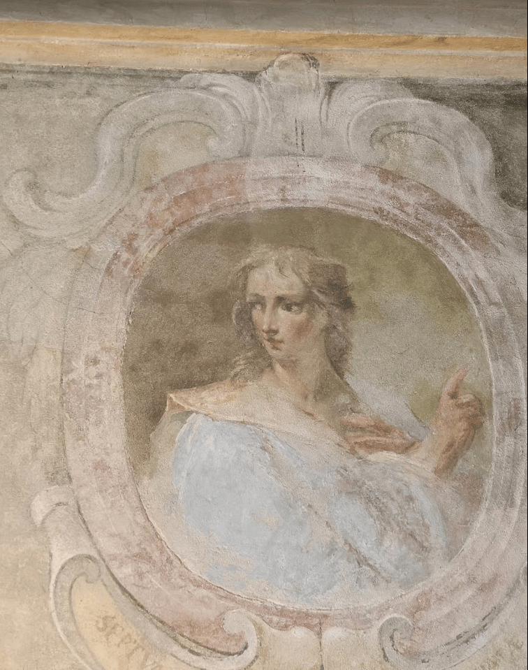 Io non sono nessuno, sono solo una cronista flâneuse prestata al giornalismo culturale; ma a me par di scorgere in quel volto, in quei colori, in quella delicatezza delle vesti cerulee i tratti tipici del periodo delle Sibille di Sala Veratti, vale a dire dell’antico refettorio che fu tutt’uno con il chiostro delle benedettine estinto da Napoleone, poi acquisito dalla famiglia Veratti e parcellizzato in abitazione padronale, botteghe e opifici.