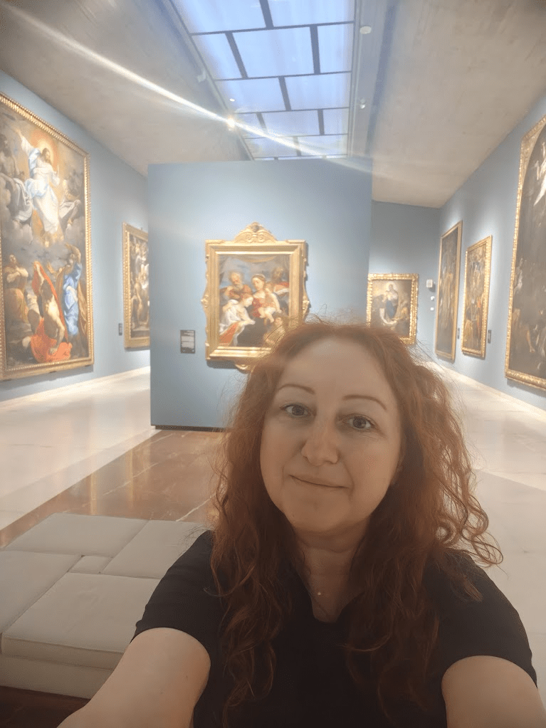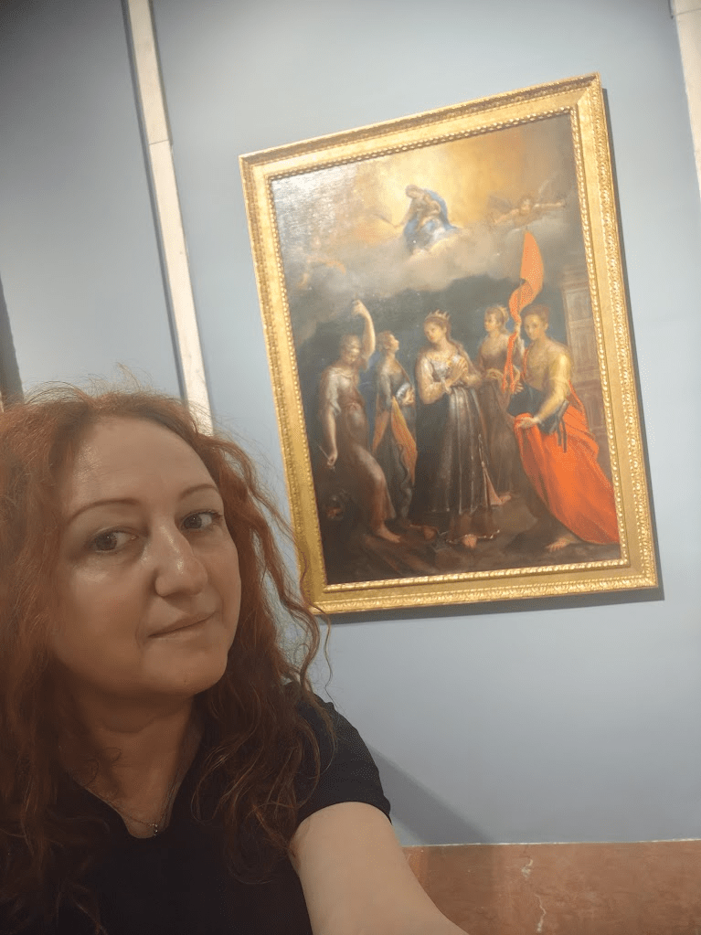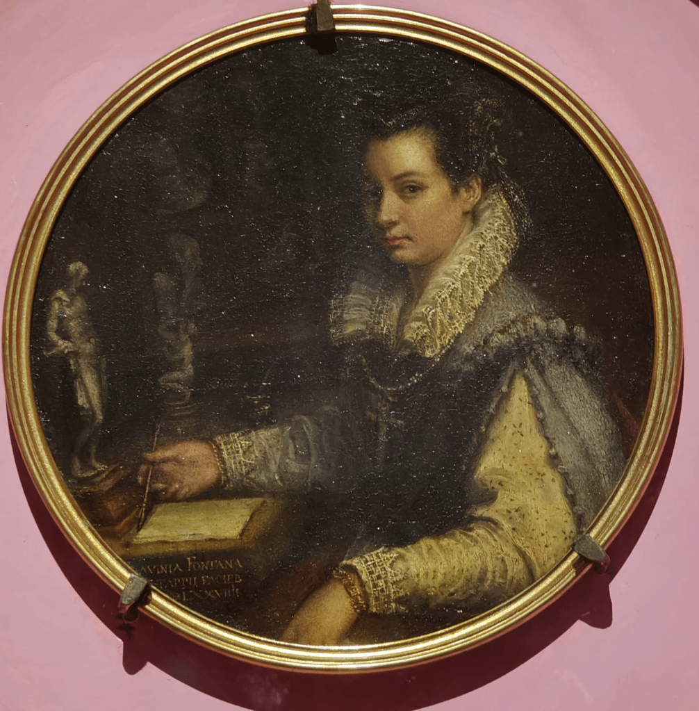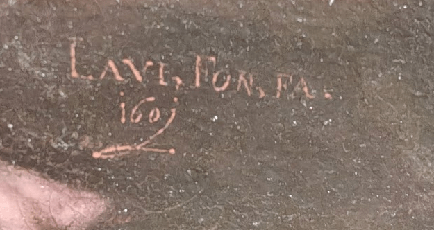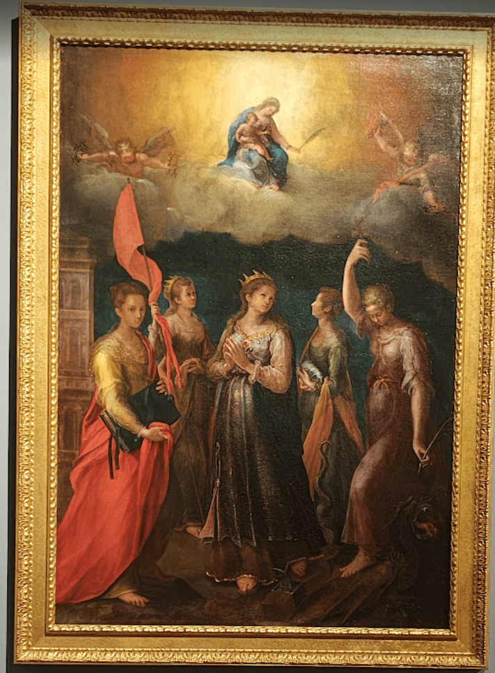 Torna sant’Orsola nella piccola ma splendida pala di Lavinia Fontana che rappresenta l’Apparizione della Vergine fra le sante Caterina d’Alessandria, Margherita, Agnese, Orsola e Barbara, firmata e datata 1601. In essa, forse proprio in sant’Orsola – seconda a destra dopo Barbara – si celerebbe l’autoritratto della pittrice bolognese (1552-1614), cui è dedicata la sezione che troneggia nella sala: omaggio doveroso alla caposcuola del Manierismo pittorico femminile di cui si conserva un minuscolo autoritratto, un olio su rame, datato 1579 anche nella galleria dedicata ai progenitori dei “selfie” d’artista agli Uffizi: l’ho fotografato nel mio recente viaggio fiorentino per voi. Vi assicuro che è proprio piccolo: misura infatti 15,7 x 15, 7 cm!