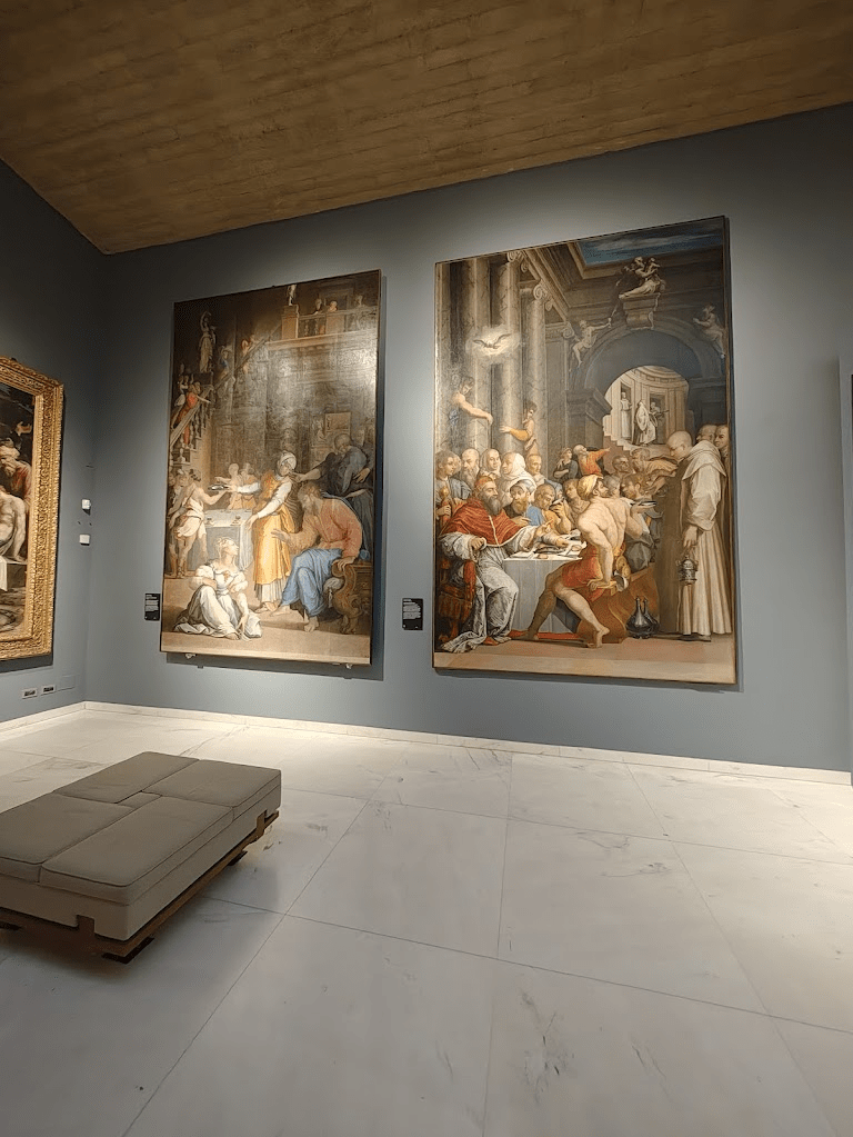 Visto che scrivo nel giorno natale di Giorgio Vasari (Arezzo, 30 luglio 1511- Firenze, 27 giugno 1574) non potrei dimenticarmi di omaggiare il padre della storia e della critica d’arte molto ben rappresentato in Galleria. Giustamente, di fronte alle sue imponenti tavole – Gesù in casa di Marta e Maria e Cena di San Gregorio Magno – si è disposto un comodo divano pouf (e ve ne sono diversi altri lungo il percorso, così come in pinacoteca) dove potersi fermare il tempo desiderato. Trovo questa strategia d’allestimento rispettosa dei tempi personali della contemplazione e molto intelligente. Le due opere facevano parte di un ciclo pittorico più ampio commissionato nel 1539 e destinato al monastero degli Olivetani dedicato a san Michele in Bosco, dove Vasari è attivo nel biennio 1539/40, a partire dai quali si fa partire il rinnovamento manierista bolognese.