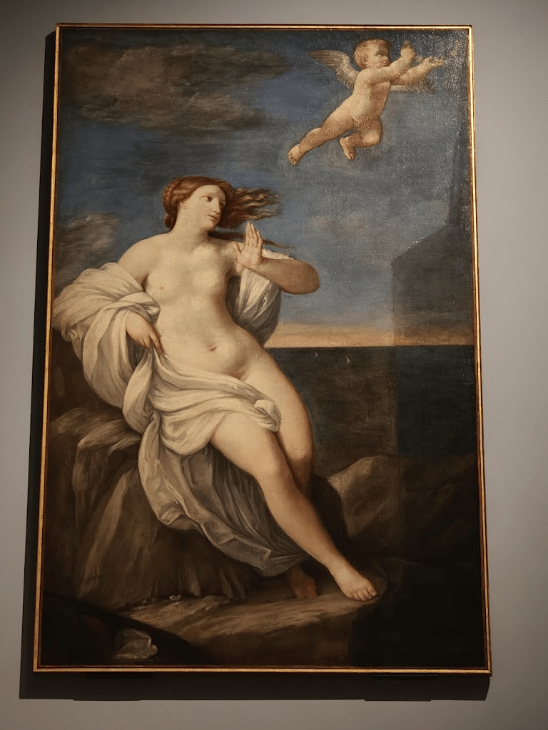 Concludono, per noi, ma in realtà aprono il vasto percorso all’ingresso della galleria le opere monumentali di Guido Reni (1575-1642), fra i maggiori artefici del Barocco emiliano e nazionale. Scelgo volutamente fra le meraviglie del secentista bolognese due tele che mi affascinano in maniera particolare. Commissionata dal cardinal Barberini quale dono per Enrichetta di Borbone, moglie del sovrano inglese Carlo I Stuart, la tela di Arianna (1639), allusiva della leggenda classica della fanciulla abbandonata da Teseo sull’isola di Nasso, è opera tarda del Reni, in realtà un frammento facente parte di un ciclo più vasto legato all’iniziazione di Arianna al culto di Bacco. Come giustamente spiega il pannello di corredo, l’opera fu recapitata alla regina ormai in esilio in Francia dopo lo scoppio della guerra civile inglese: ma presto la corona la vendette per sanare i debiti di guerra, pare con grande dispiacere di Enrichetta.