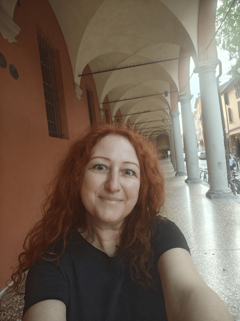 La Voce di nero vestita sotto i portici delle Belle Arti in Bologna, nei pressi della Pinacoteca Nazionale.