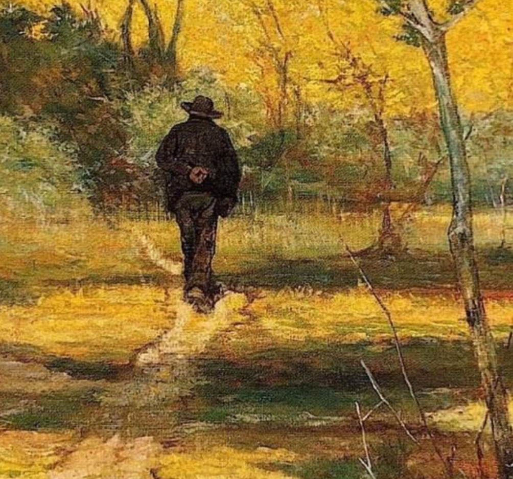 L’opera di cui vi voglio parlare oggi è “L’uomo nel bosco”, realizzata fra 1880 e 1885. Nella solitudine di un sentiero immerso nella natura autunnale un uomo vestito di scuro, protetto da un cappello a falda larga cammina, dando le spalle all’osservatore, immergendosi in un percorso di solitudine. I colori della selva non sono cupi ma accoglienti, caldi, in colloquio con la pensosità del personaggio che stranamente non possiede ombra propria, quasi fosse costituito di sola anima, come un novello Dante che attraversa la selva durante il rapimento del sogno: la genesi onirica, una delle ipotesi più affascinanti per l’interpretazione della Commedia, risalente ai suoi primissimi commentatori.