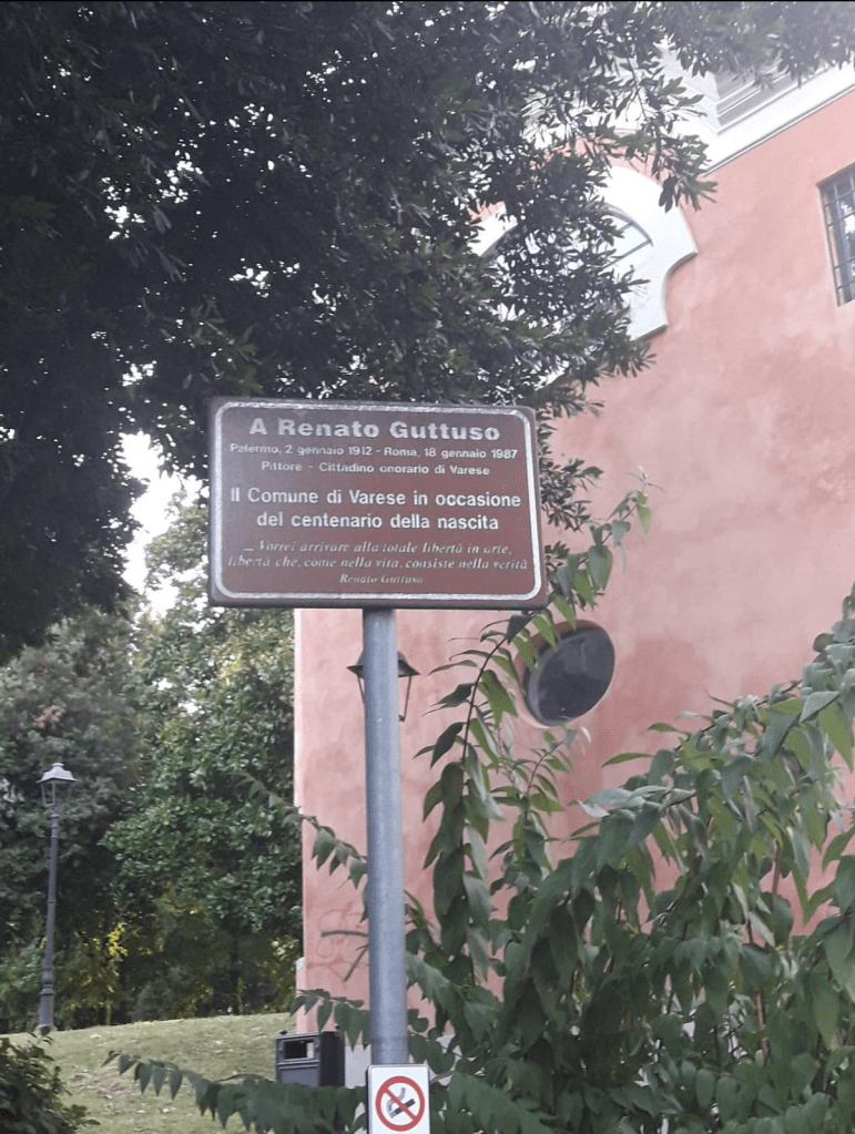 La targa di dedica del percorso nei giardini di Villa Mirabello, Varese, a Renato Guttuso.
