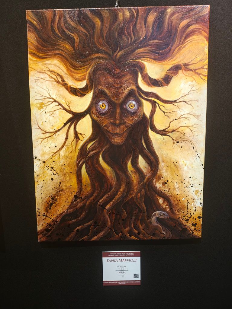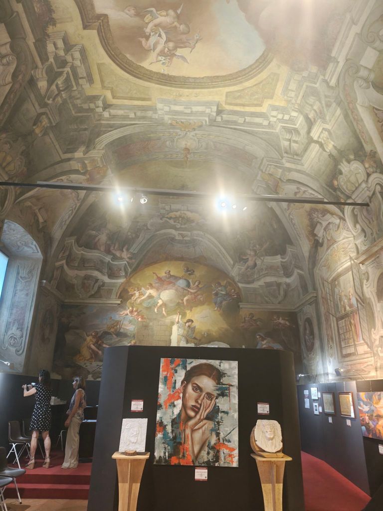 Sala Veratti, che fu l’antico refettorio del chiostro di Sant’Antonino, ha una storia fascinosa che ho anche studiato in archivio di recente, ma che in questo momento non ho testa o volontà di rievocare: solo, basti sapere che nel 1927 l’allora podestà Domenico Castelletti in qualità di vate del nascente Circolo degli Artisti l’affittava dalla famiglia Veratti per consacrarla alle esposizioni d’arte non ospitabili nel più solenne ed ufficiale Salone Estense. Ecco perché mi risulta tanto fascinosa ed azzeccata l’attuale mostra che perdurerà sino a tutto agosto ospitando opere dei cosiddetti Artisti Indipendenti varesini.