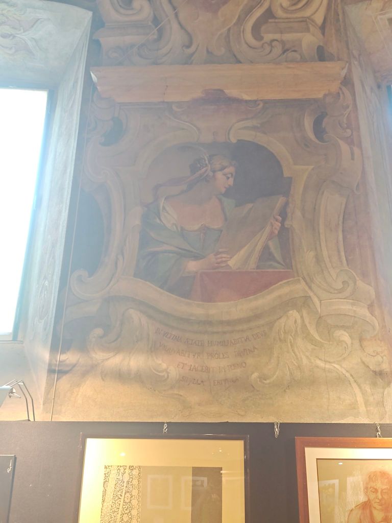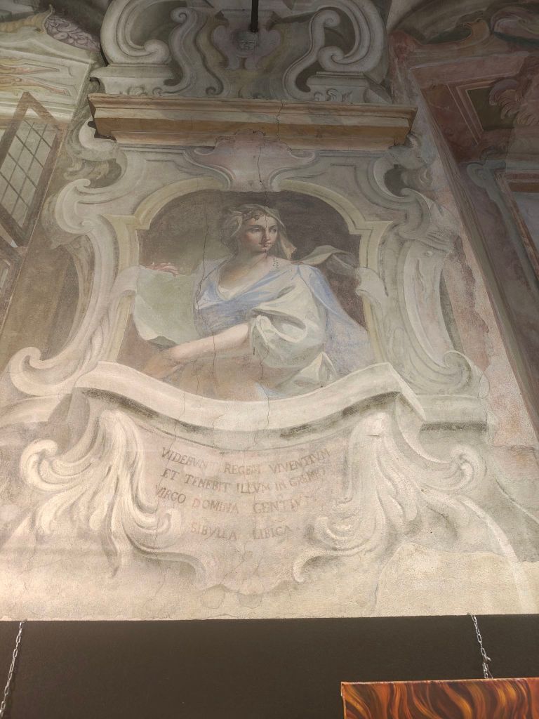 Io non sono nessuno, sono solo una cronista flâneuse prestata al giornalismo culturale; ma a me par di scorgere in quel volto, in quei colori, in quella delicatezza delle vesti cerulee i tratti tipici del periodo delle Sibille di Sala Veratti, vale a dire dell’antico refettorio che fu tutt’uno con il chiostro delle benedettine estinto da Napoleone, poi acquisito dalla famiglia Veratti e parcellizzato in abitazione padronale, botteghe e opifici.